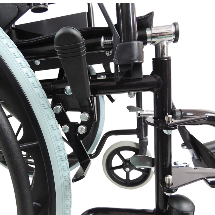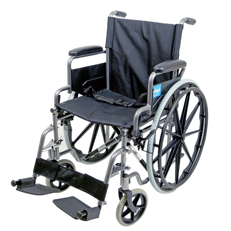The frame is made from lightweight, highly durable steel. Featuring 24" puncture proof rear wheels, 8" puncture proof front wheels, luxury padded upholstery, 18" seat width, flip back armrests, adjustable detachable foot rests, anti tip bars,lap strap and hand operated brakes.