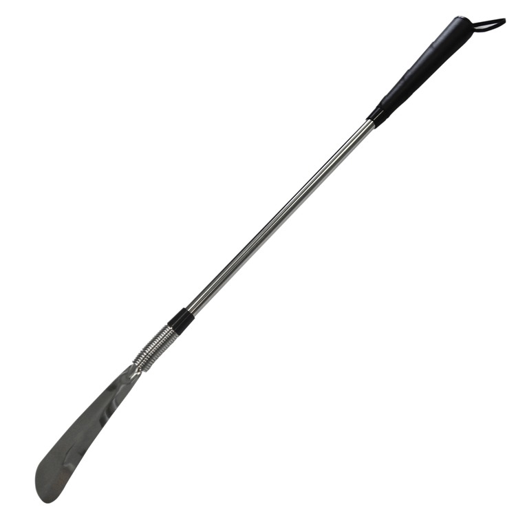 This longer length Shoehorn is designed to help the user put on shoes without bending. It is finished in chrome and features an easy grip handle and hanging loop with a flexible end.