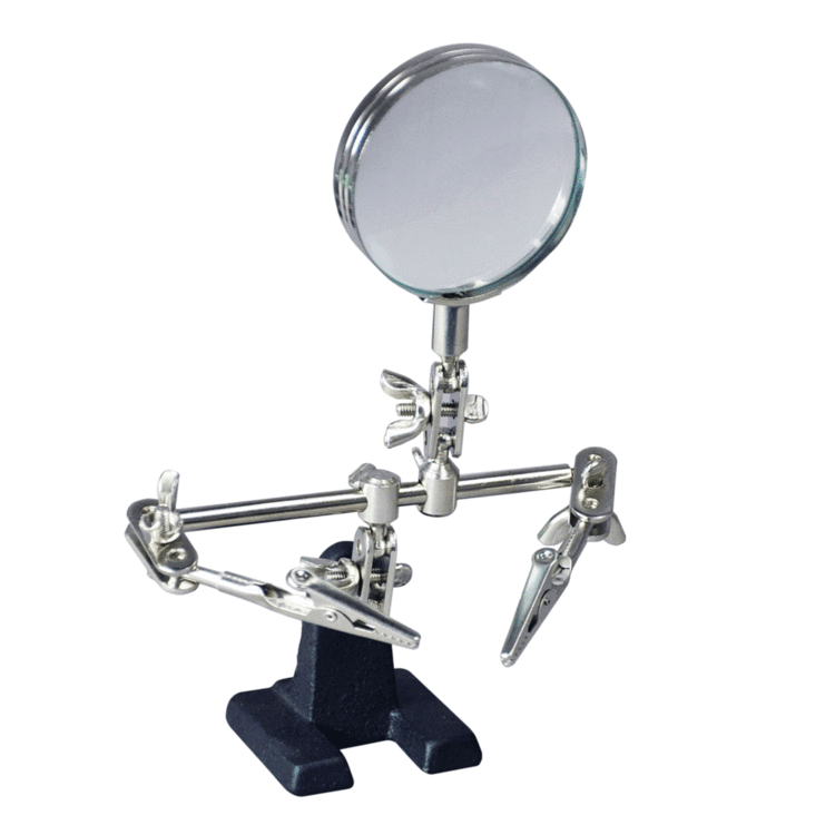 Helping hands tool featuring a round, 60 mm magnifier lens