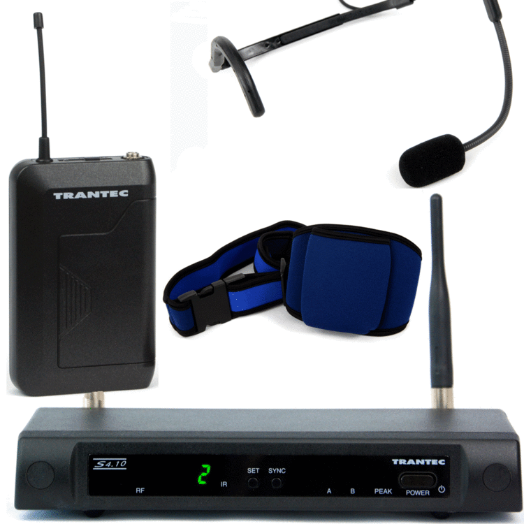 Trantec S4.10 Aerobics headmic (SJ66) radio microphone system, S4.10-W-EB, with a wireless beltpack, belt pouch and mains powered UHF wireless receiver.