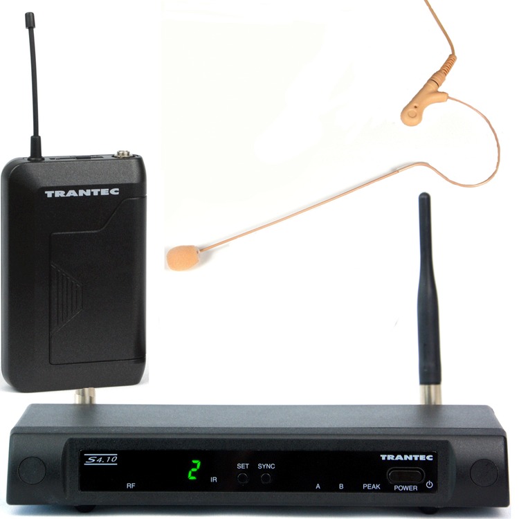 Trantec S4.10 Earworn Microphone (SJEM77-P) presenter's radio microphone system has 16 selectable frequencies with up to 10 simultaneous use channels.