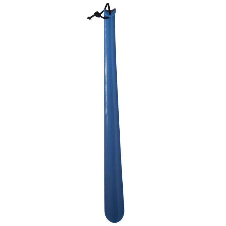 A blue, conventionally shaped Plastic Shoehorn with extended