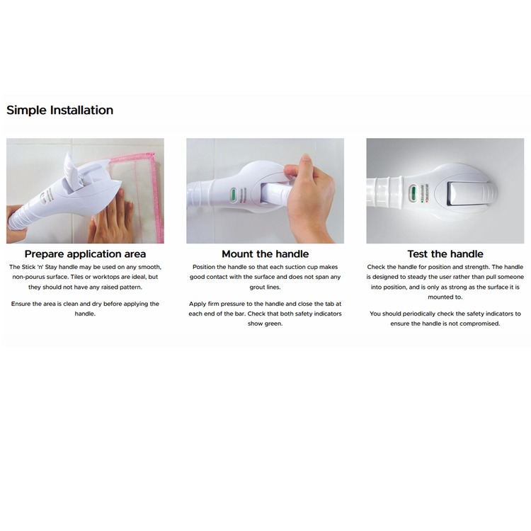 There is a special safety indicator which shows GREEN when the handle is securely fixed to a surface and RED when the handle needs to be re-positioned.