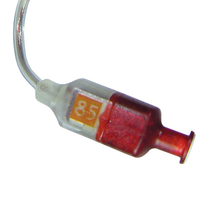 The Oticon RITE MiniFit receivers are supplied in left and right variants as well as different lengths. The length is denoted by a number and left ear by a blue housing and right ear by a red housing. The power level of your receiver is indicated by a coloured square - this 85 M (Moderate/Medium output, ) MiniFit receiver speaker has 85 in an orange square on a red shell for right ear and marked 4 for size 4 on the other side.