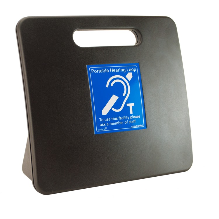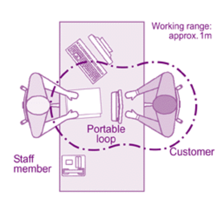 With no wiring or setting up, other than lifting the unit onto a table and switching on, the ILPL20 can be stored until required and be ready for use within seconds as long as the batteries are charged! The unit is simply placed on the desk/counter and the member of staff sits behind the unit and speaks, the integral microphone picks up the sound of speech and a green LED flashes to indicate that the unit is working. The hearing aid user sits in front of the unit with their hearing aid set on T and will hear the speech directly through their hearing aid.