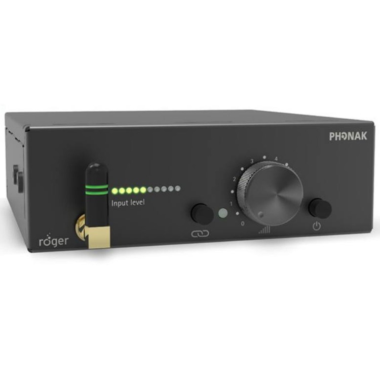 The Roger BaseStation stationary transmitter, delivers high quality speech signals to the wireless Roger Earpiece. Using Phonaks new digital standard at 2,4GHz and fully automatic frequency hopping technology ensures that the signal is transferred to the in-ear receiver in unrivalled sound quality.