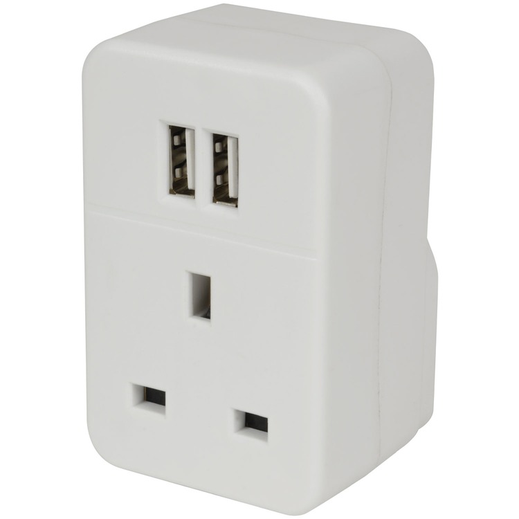A mains adaptor with twin USB ports to allow items fitted with a standard UK 3 pin plug to be used in a European Schuko socket. An essential piece of equipment when travelling to Europe on holiday or business, ideal for charging smartphones, tablets and other portable USB devices.