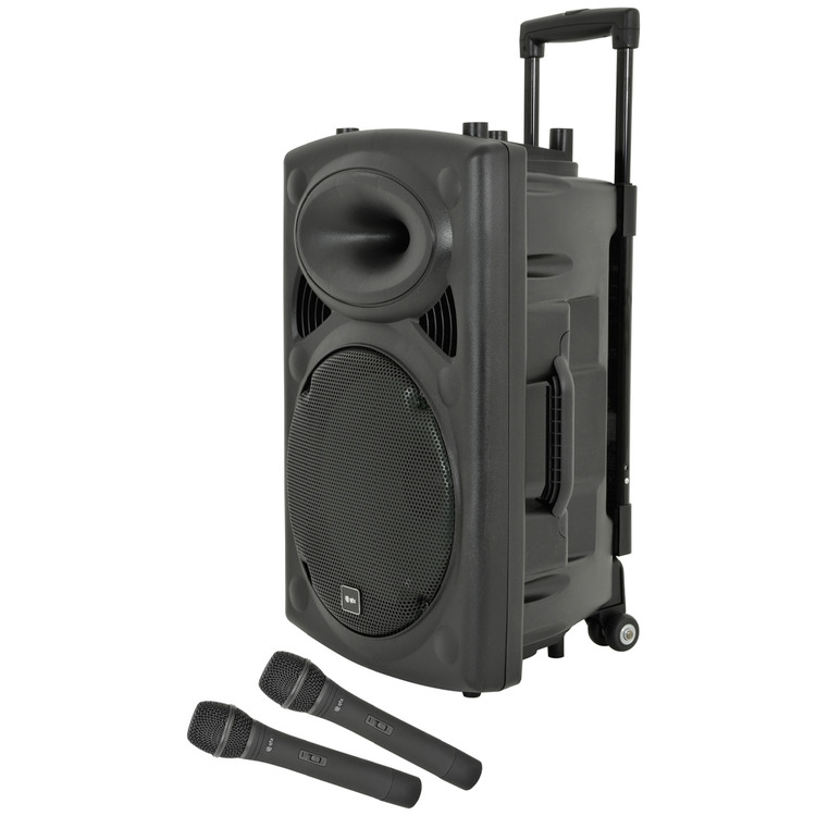 Two VHF handheld wireless microphones are included with the receiver built into the mixer/amp section at the rear along with a further two wired mic inputs, auxiliary line input and integral USB/SD/FM media player with record function.