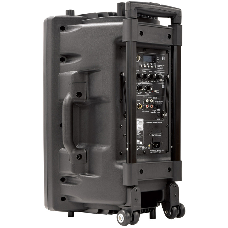 A B/T receiver is also built into the media player to enable pairing with a smartphone or tablet for wireless audio playback. A retractable trolley handle and rear wheels provide easy portability.