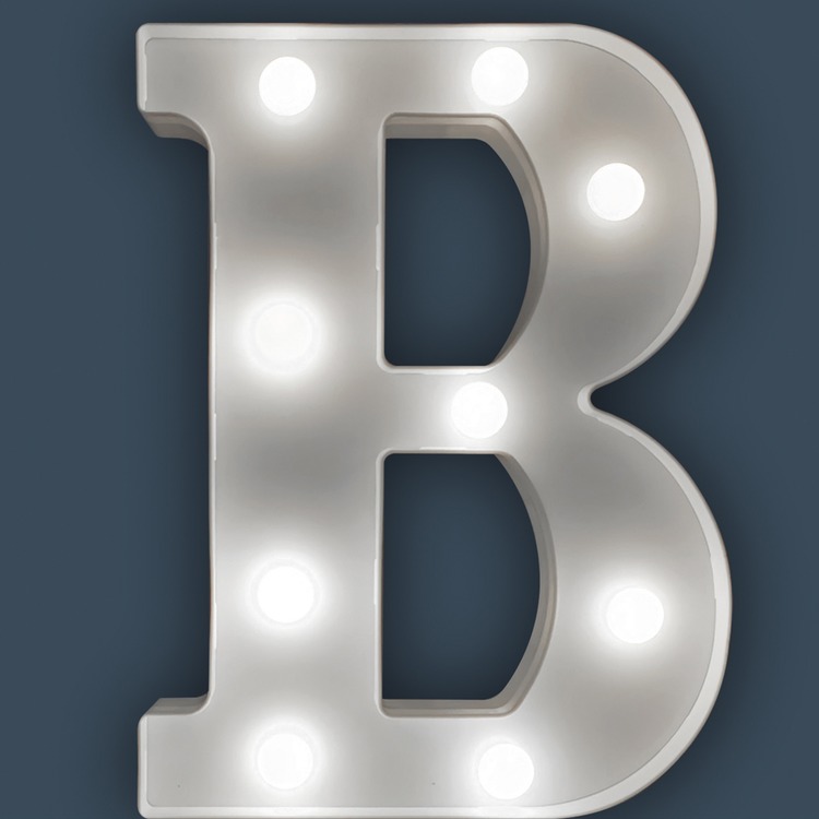 Battery Operated 3D LED Letter 'B' Marquee style light. Great for creating names, words, phrases or ages and years at birthday parties, weddings, anniversaries and other events. The neutral colour means they will easily fit with any aesthetic. They also look great as a feature in any home such as the lounge or bedroom.