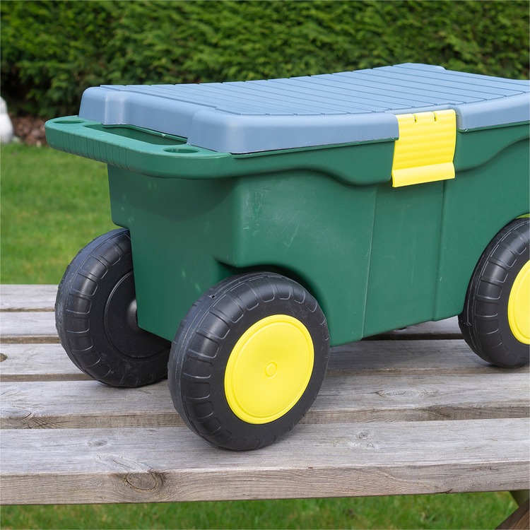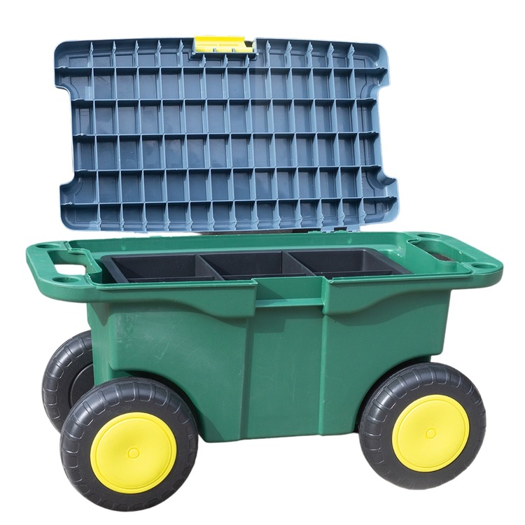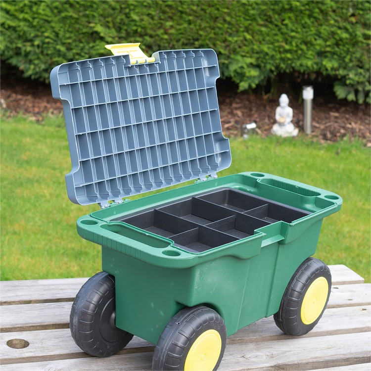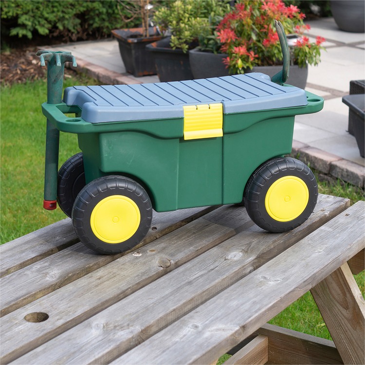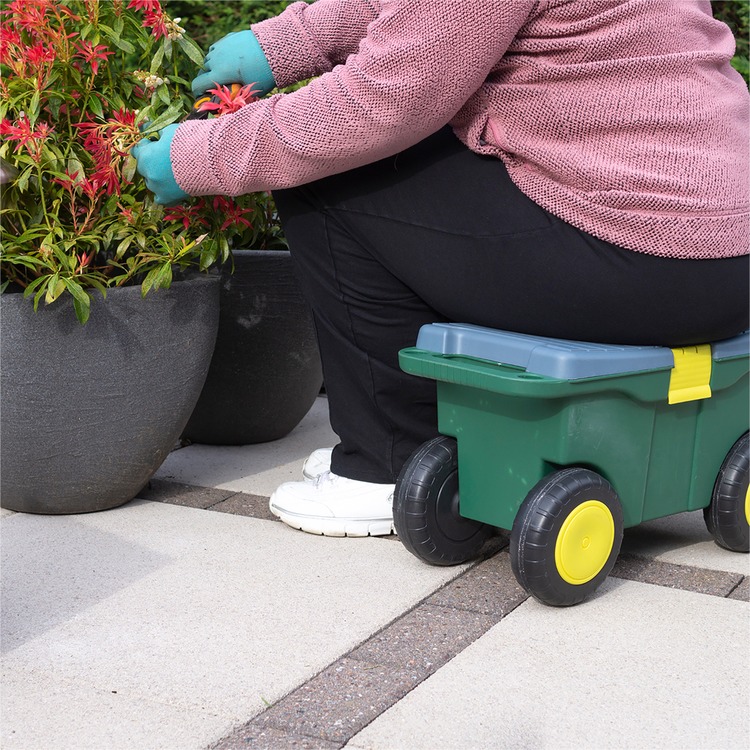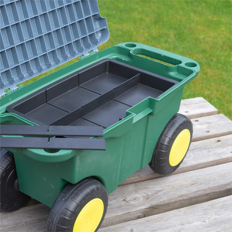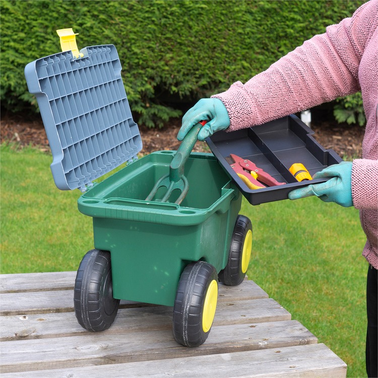 A large compartment under the seat to store tools and supplies such as trowels, gardening gloves and string.