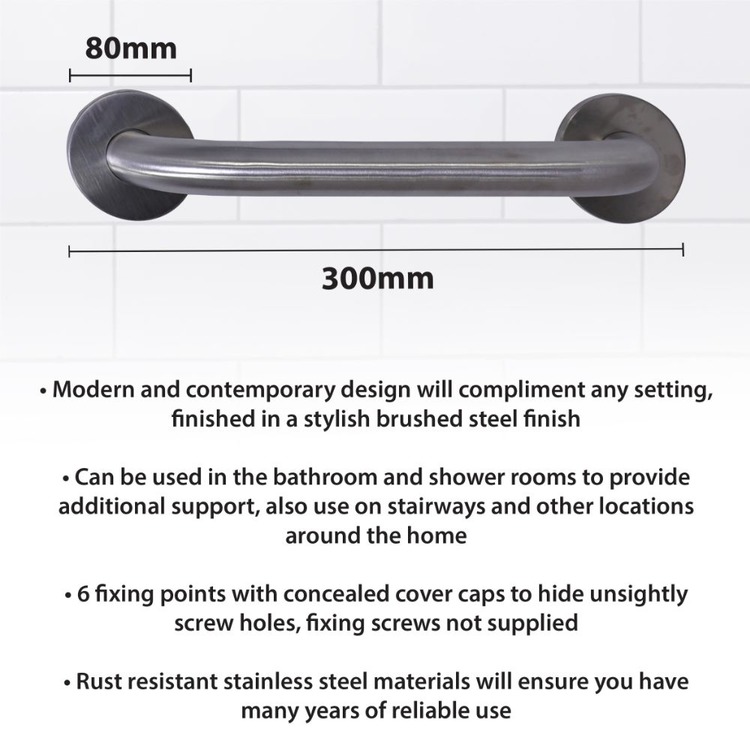 300mm Stainless Steel brush finished Chrome/Silver Grab Bar ideal for use in and around the home, particularly bathrooms and showers for extra support and peace of mind.