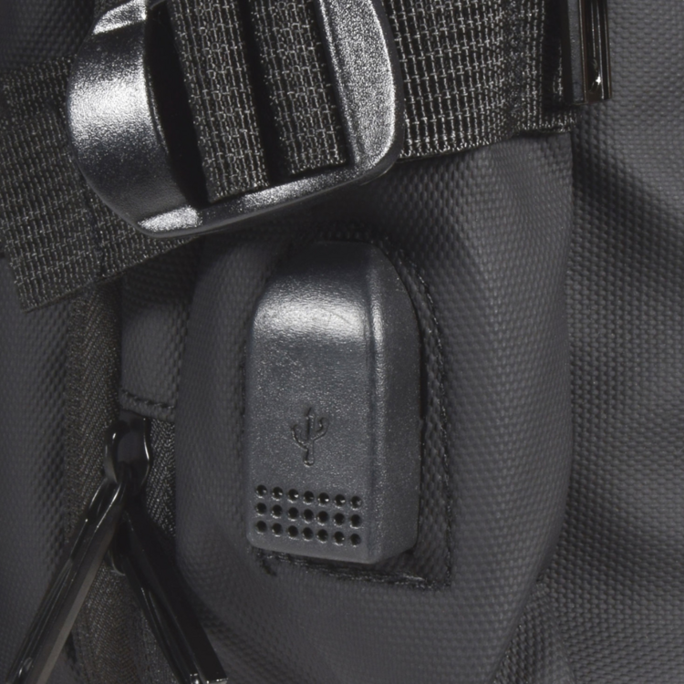 It has an integrated USB port and cable connection so you can charge your electronic devices without the inconvenience of carrying the charger.