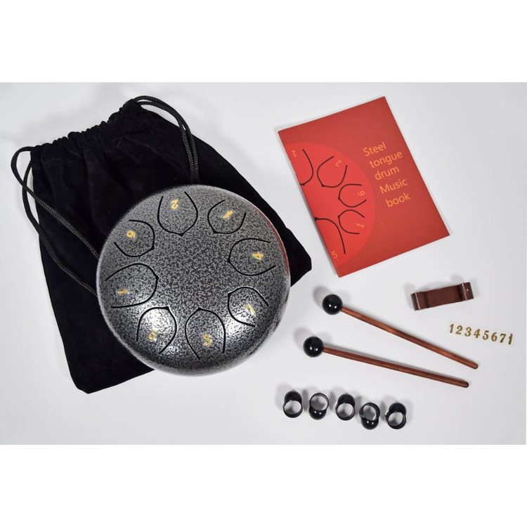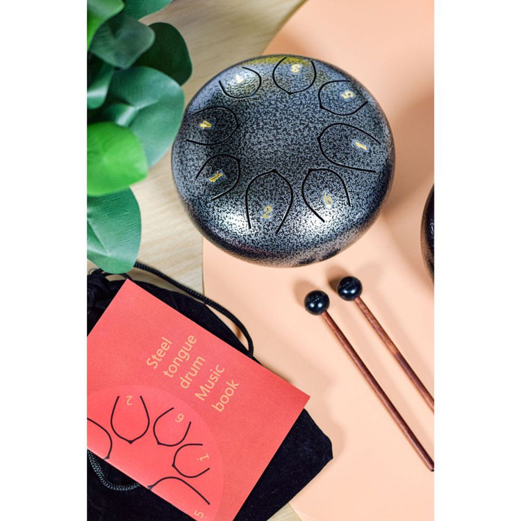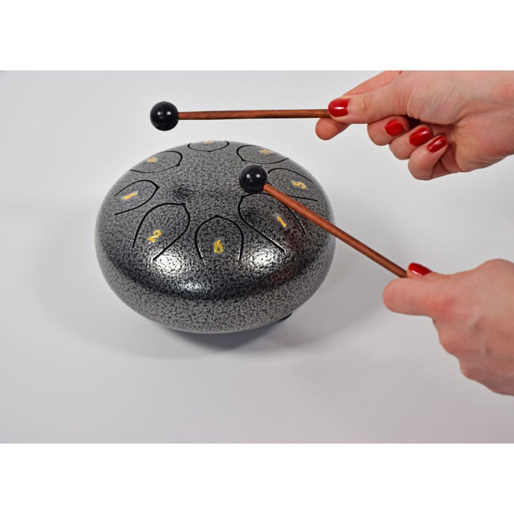 Small steel tongue drums with 8 notes on lotus petal-shaped tongues for finger or stick percussion. Ideal for educational use, meditation and therapy settings.