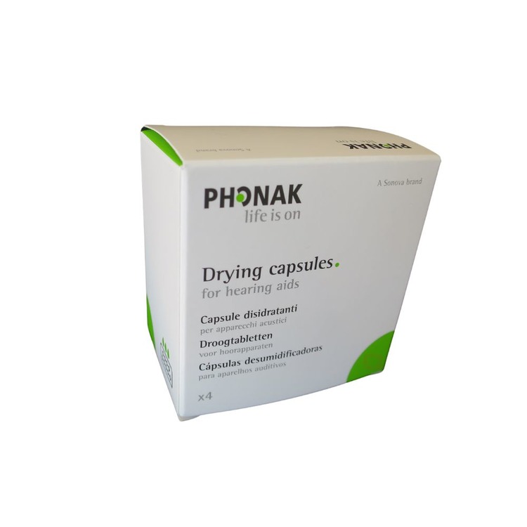 Pack of 4 separately packaged silica drying capsules for dehumidifying hearing aids and earmolds, which will reduce the chance of faults due to moisture.