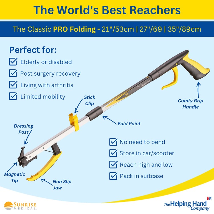The Classic Pro Folding Reacher 53cm (21") from The Helping Hand Company is a long handled grabber stick. Ideal for elderly, disabled, or indeed, anyone who finds bending and reaching a struggle.