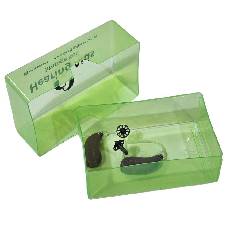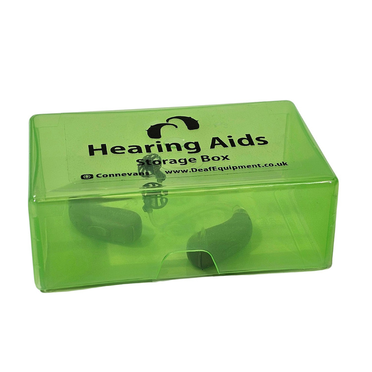 A small, lightweight hard plastic storage box for hearing aids - great for keeping them safe when not in use.