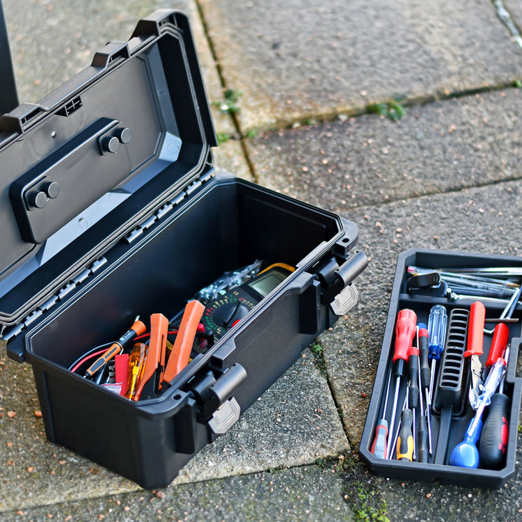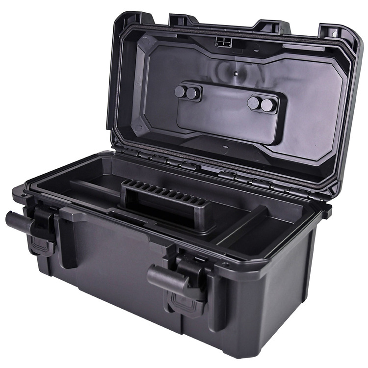 Heavy duty tool or equipment case made from 4mm thick high impact injection-moulded polypropylene with a rubberised handle, hinged lid and removable tray.