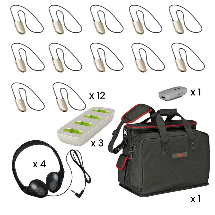 What's in the kit: 1 x Storage bag, 1 x Roger Clip On Mic with charging docking station, 12 x Roger neckloops with chargers, 3 x Roger Charging Racks with Neckloop adaptors & 4 x headphones