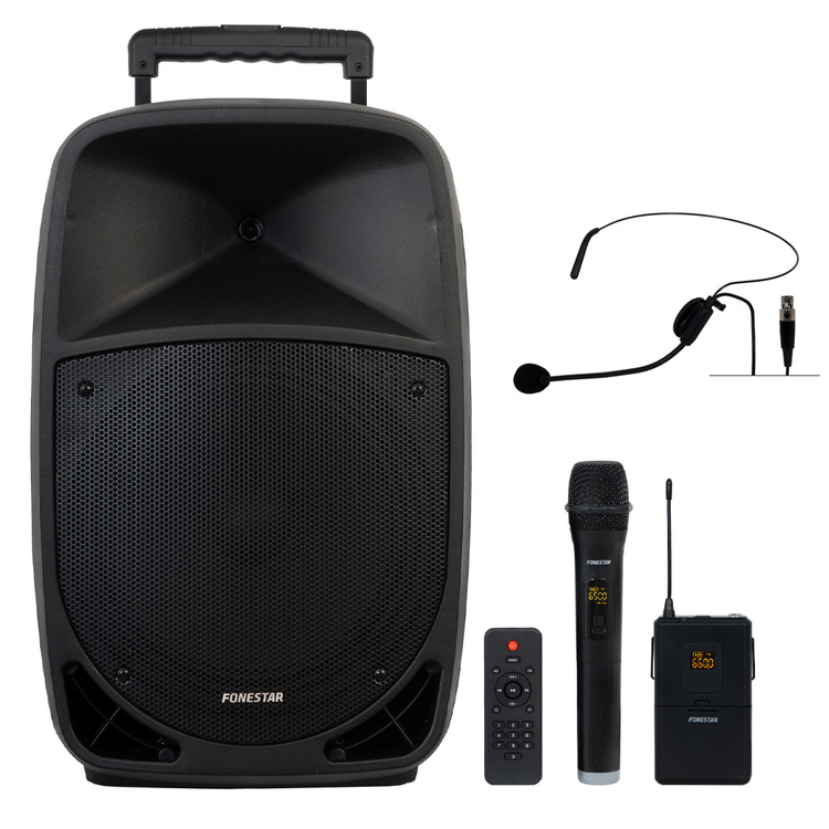 MALIBU-312 Portable speaker with Bluetooth/USB/microSD/FM/LINE player and 2 UHF wireless microphones (1 hand-held, 1 head-worn).