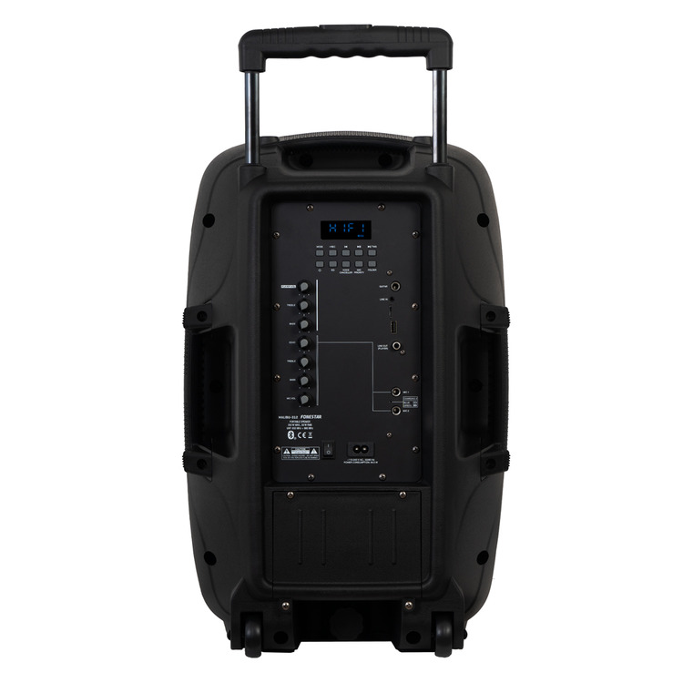 2 x UHF wireless microphones, 1 hand-held and 1 head-worn (650 MHz and 660 MHz respectively). Bluetooth/USB/microSD/FM/LINE player and microphone audio recorder. Bluetooth receiver 5.0. Karaoke function with Voice Canceller, priority, microphone controls (echo, bass and treble) and independent volume control of music and microphones. TWS function for pairing two speakers via Bluetooth and transmitting USB, microSD, FM or LINE IN. Guitar input. Input for microphone with cable. Rechargeable Li-ion battery. BASS REFLEX reinforcement. Remote control of the player. Trolley transport cart. Hole in the base for 35 mm tube. |