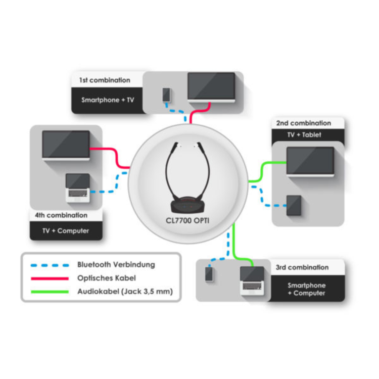 The CL7700 OPTI is a stylish, top quality headset with a charging base / transmitter which can be connected to virtually all televisions, laptops, music players, and iPods. You do not need to have a Bluetooth-compatible TV to use this headset as the handy base connects into the back of your TV using standard optical or analogue cables. The headset provides high quality CD sound and is useful in situations where members of the same household do not wish to watch the same TV program together. By wearing this headset, one can watch TV without disturbing those around, who might prefer to read.