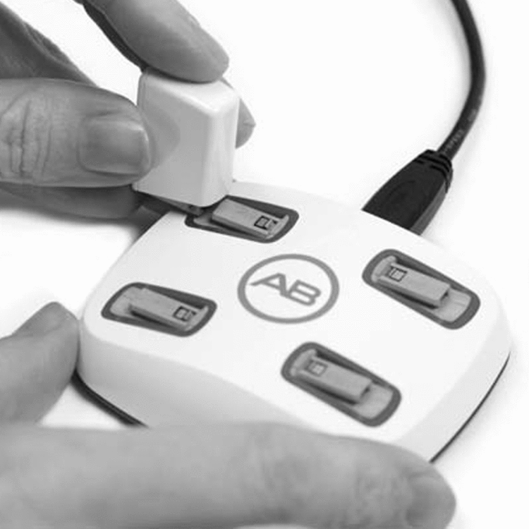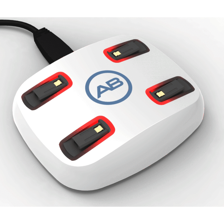 Charger for up to 4 rechargeable PowerCel batteries for the Naida CI from Advanced Bionics.