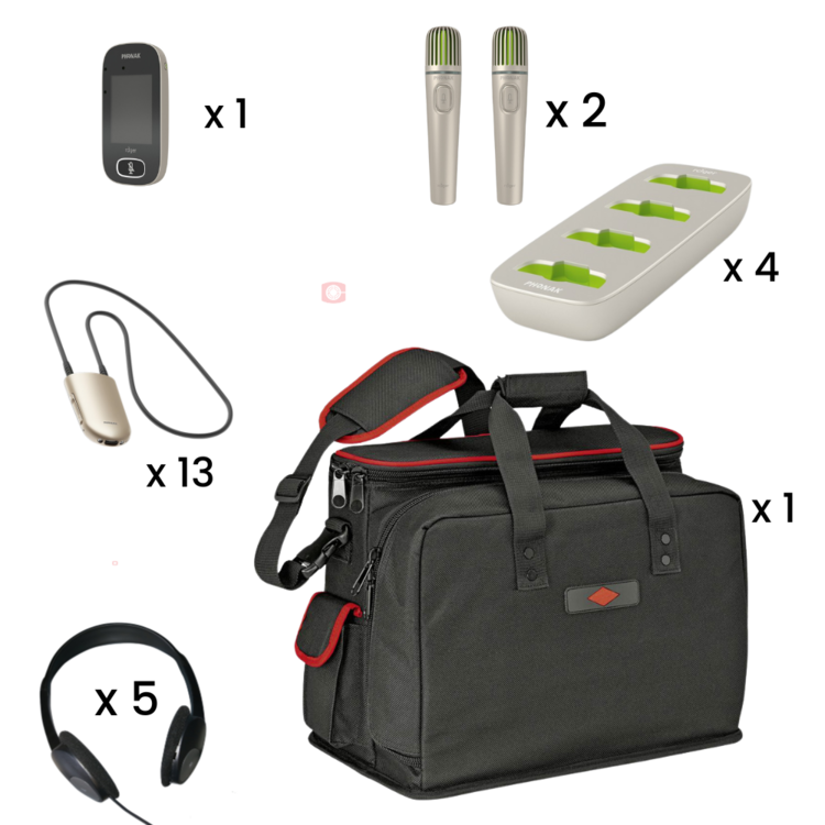 In the package: 1 x Roger Touchscreen Mic 3, 2 x Roger Pass-Around Mics, 13 x Roger Neckloops (with charging adaptors), 5 x pairs of headphones, 4 x Roger Charging Racks, 5 x headphones & 1 x Carry Bag, which has extra space for laptop etc. and Connevans telephone support.