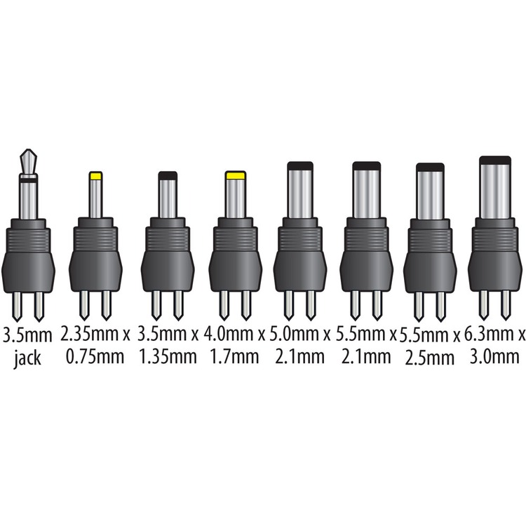 Adaptor plugs 3.5mm jack, 2.35 x 0.75mm, 3.5 x 1.35mm, 4 x 1.7mm, 5 x 2.1mm, 5.5 x 2.1mm, 5.5 x 2.5mm, 6.3 x 3mm