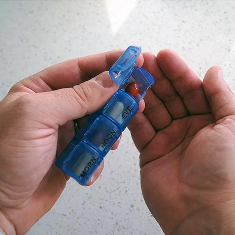 This handy organiser has seven compartments, Monday through Sunday, each with a container to hold four daily doses of medication.