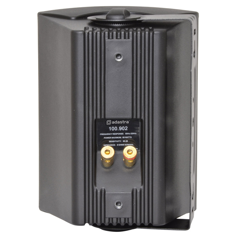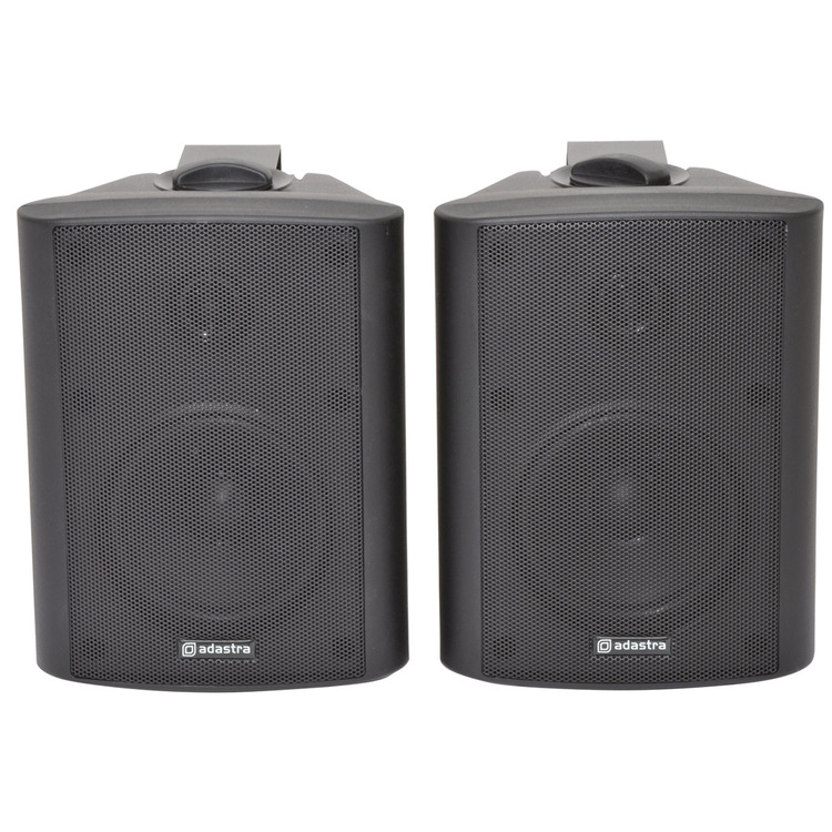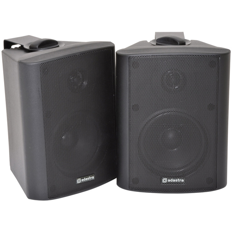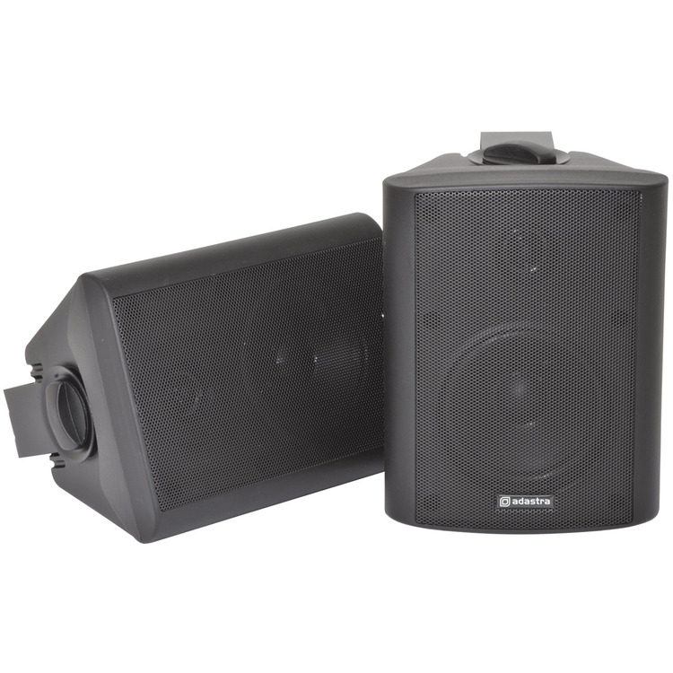 Industry standard black indoor speakers with ABS enclosures and a powder coated steel grille. Wall or ceiling surface mounting via the adjustable steel bracket. Each with standard 8 Ohms impedance and supplied in pairs for connection from a stereo amplifier.