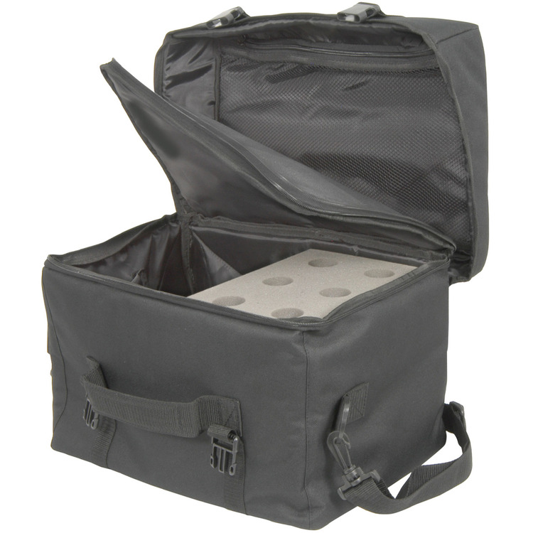 Padded transit bag with foam block holding up to 6 microphones and an adjacent segmented section for leads and other equipment.