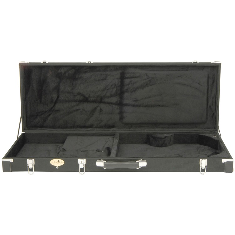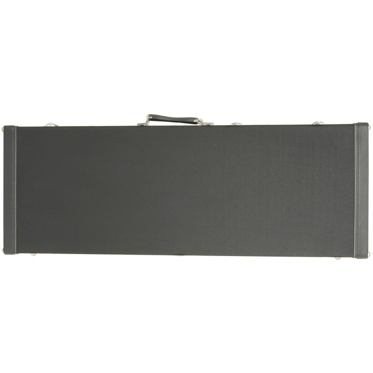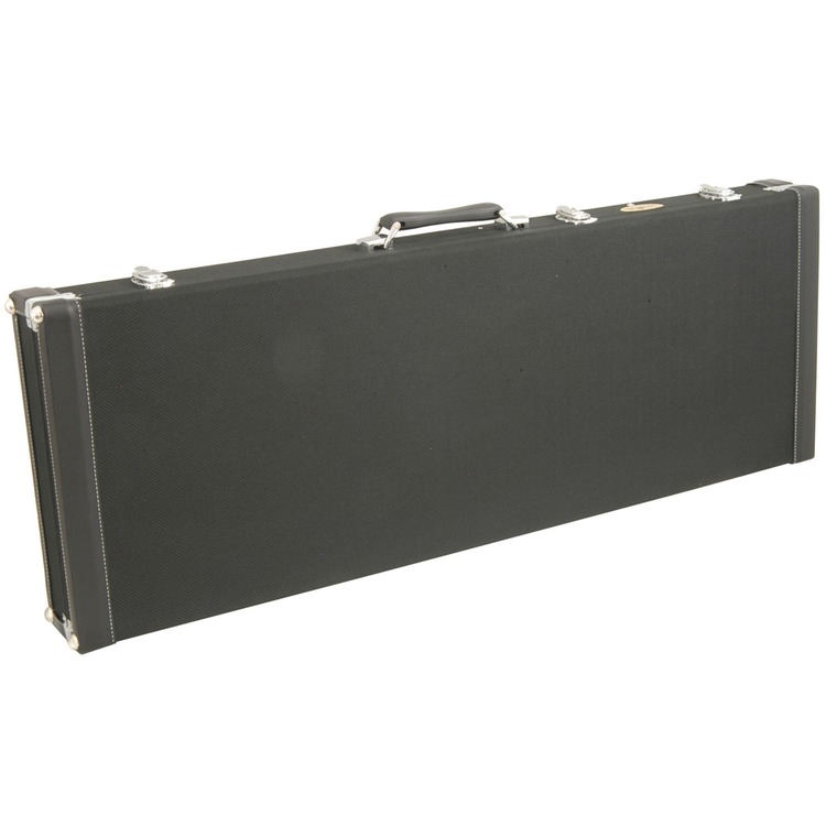 Hard, fibreboard electric guitar transit case with retro black tweed style covering and vinyl trim.