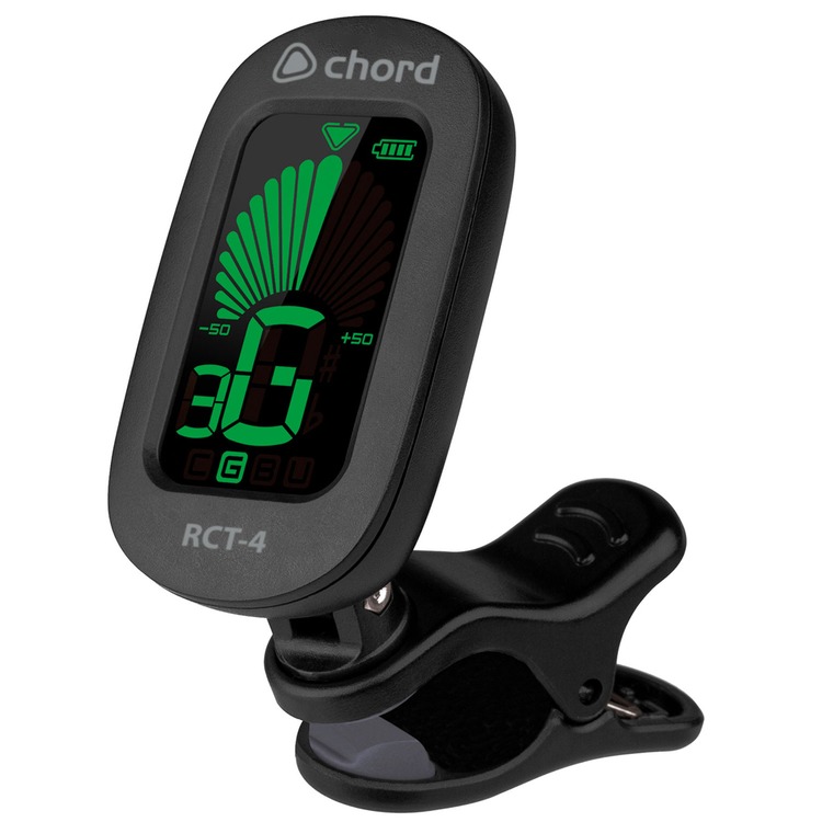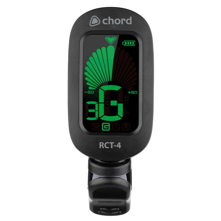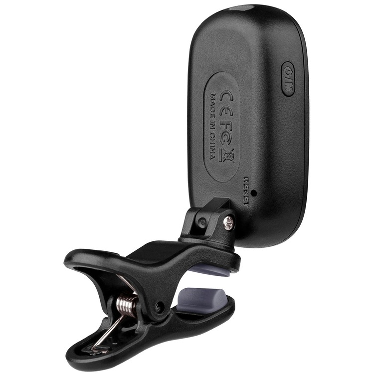 Compact clip tuner with colour changing backlit virtual needle display and internal rechargeable battery.
