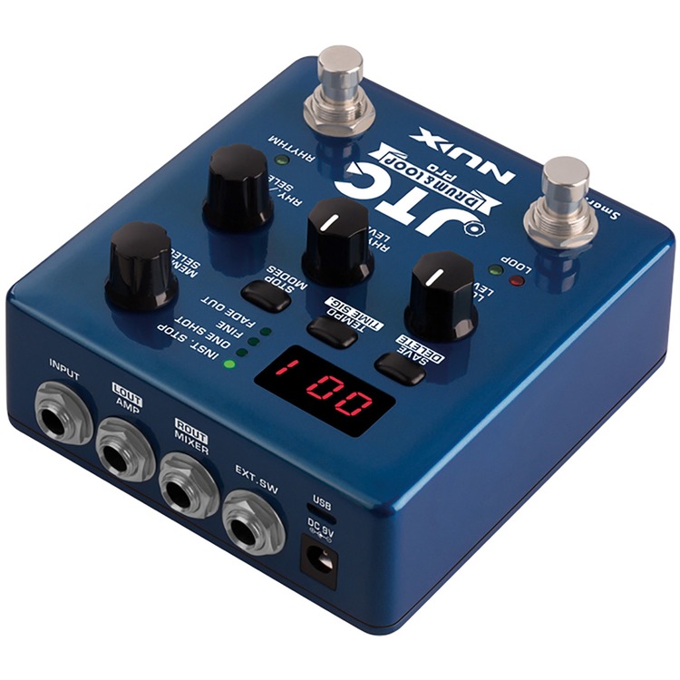 A fully functional built-in drum machine section can be controlled on-the-fly by tapping tempo and punching in fills on demand using the 2 footswitches. A USB interface is included for firmware updates and can even load pre-recorded audio files to be used as backing tracks.