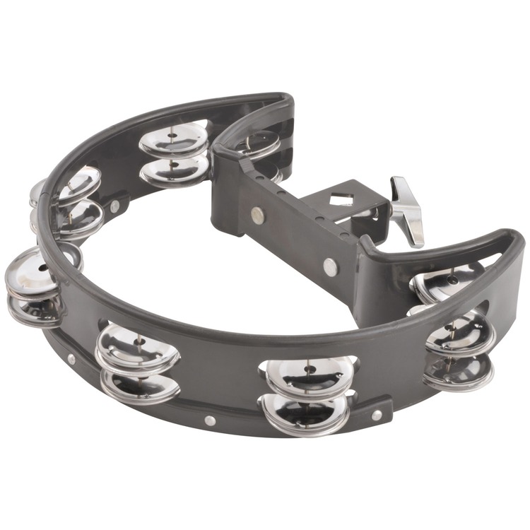 Single D tambourine in black plastic with integral clamp and reinforced striking edge for mounting over hi-hats or to a cymbal stand.
