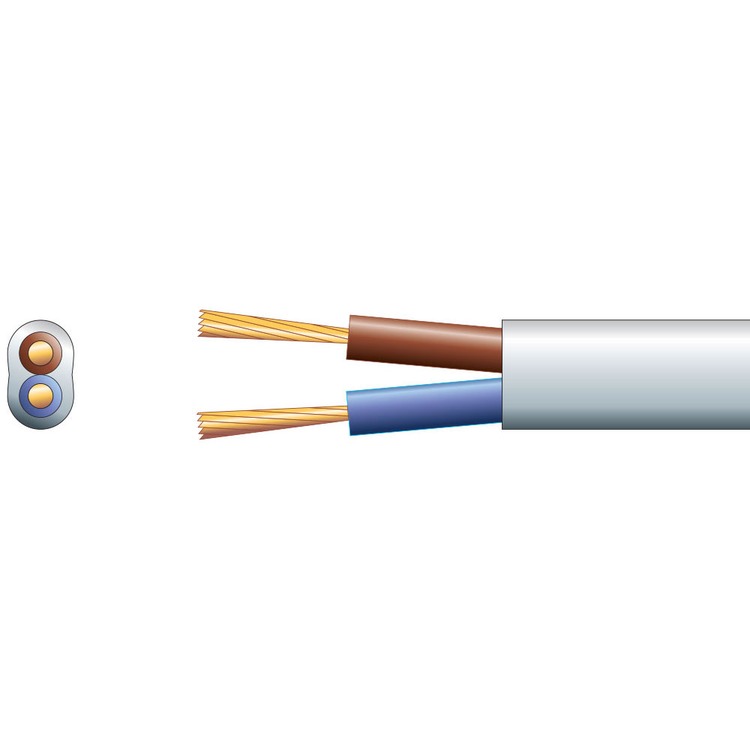 White oval profile mains electric cable. Flexible PVC sheath for use in light electrical applications.