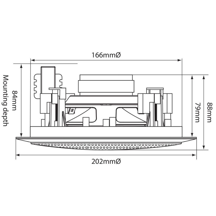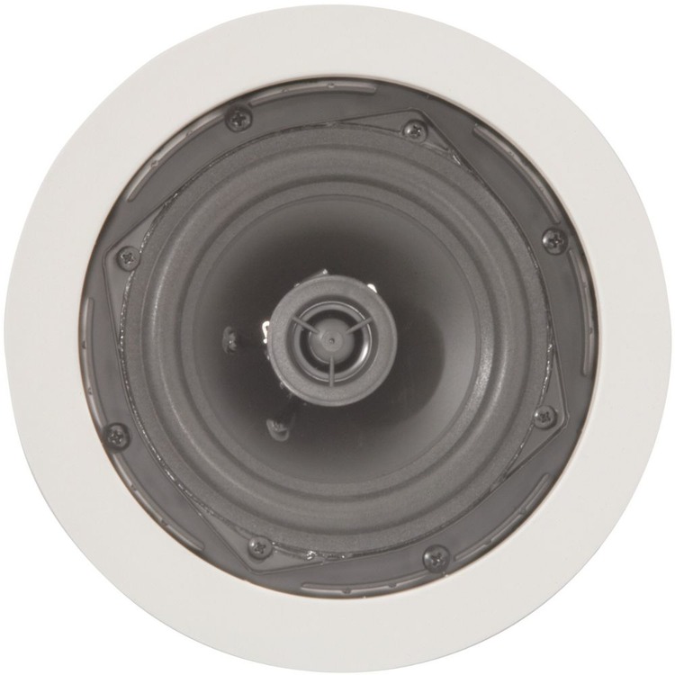 2-way quick fit ceiling speaker with PP mica bass driver and directional dome tweeter giving an excellent frequency response, all housed in a white polymer frame with metal grille.