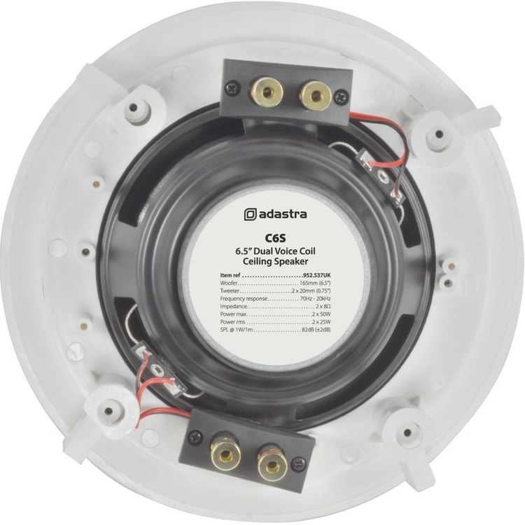 A ceiling mount speaker that provides both left and right stereo channels from a single point, whilst maintaining channel separation. The speaker has dual mylar dome tweeters combined with a dual voice coil, polypropylene woofer to deliver a full, rich sound. Ideal for installation in small rooms.