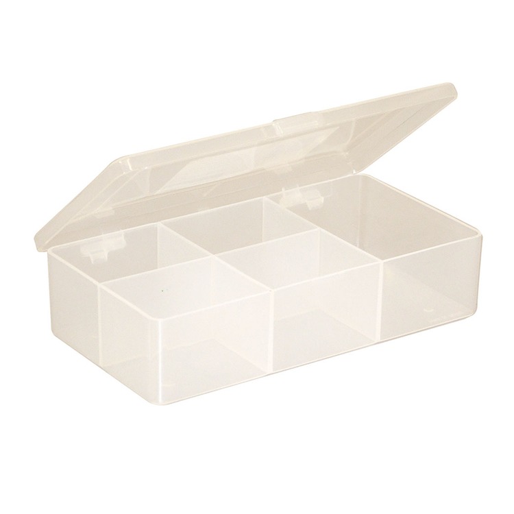 Strongly constructed polypropylene compartment storage boxes with hinged lid. Semi-transparent finish.