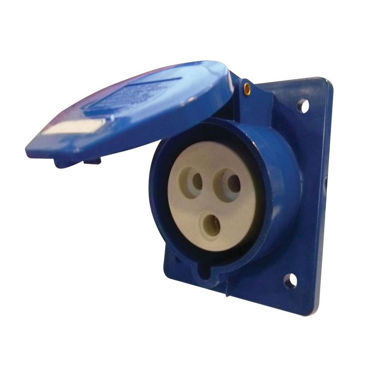 A 230 V high current 32 A angled outlet panel mount, 3 contact, with hinged flap.