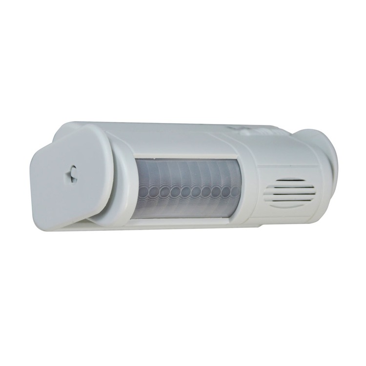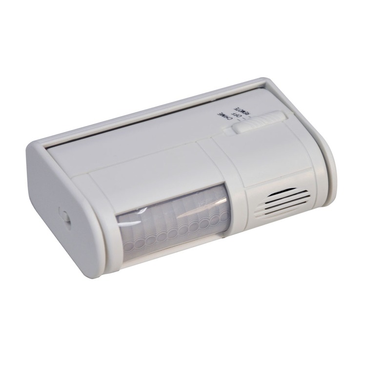 Pocket sized portable passive infrared detector alarm. Dual function alarm sounds a high pitch warble on detection, chime sounds a two-tone annunciator on detection.