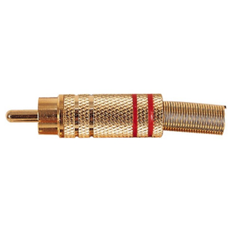 High quality phono plug with red band, metal cover, cable protector & gold plated.