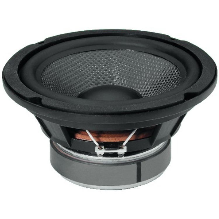 A dual voice coil bass speaker with diecast basket and carbon fibre cone, of very high power capability in very small cabinets, an ideal bass speaker for subwoofer applications of high requirements, if little space is available only.