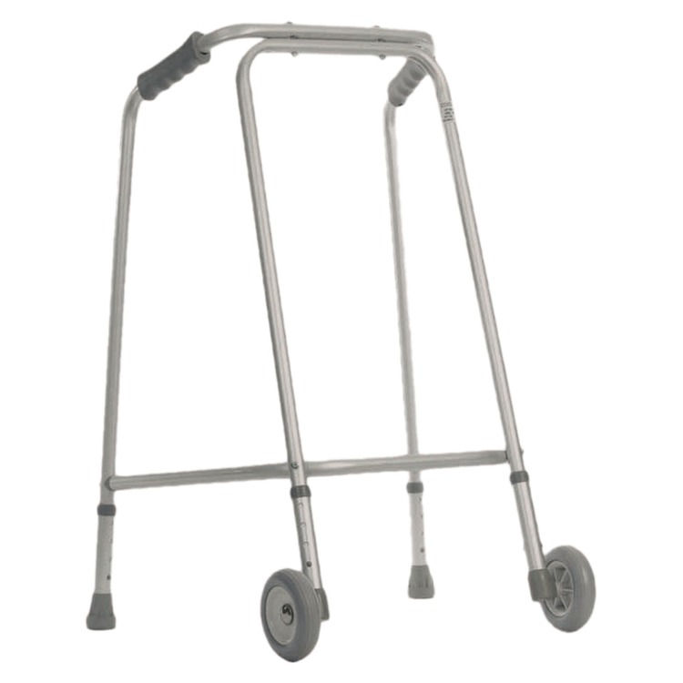 Lightweight aluminium walking frame medium sized with wheels and a wide base for maximum stability.