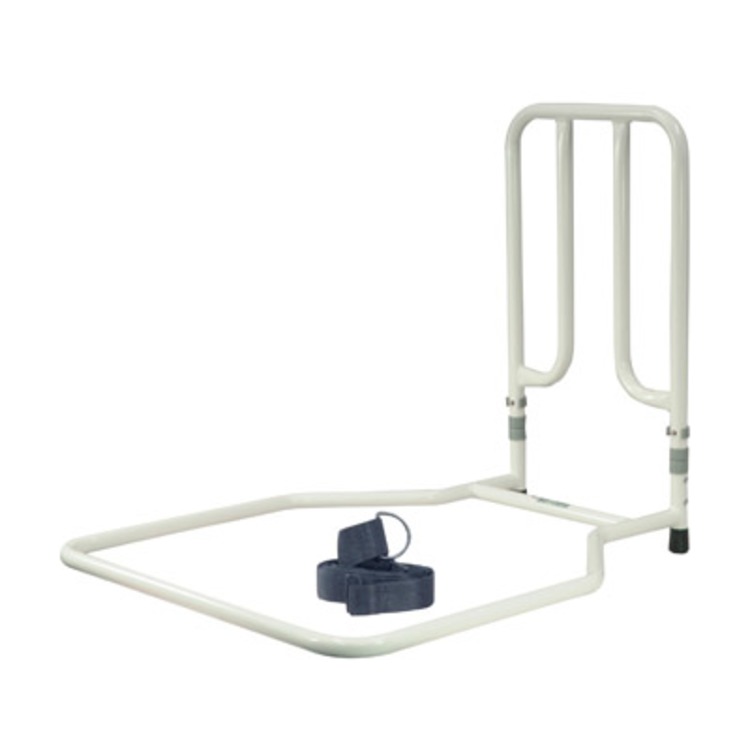 The hand grip sits above the bed and has a fixed height frame, while the base frame is large enough to provide stability.