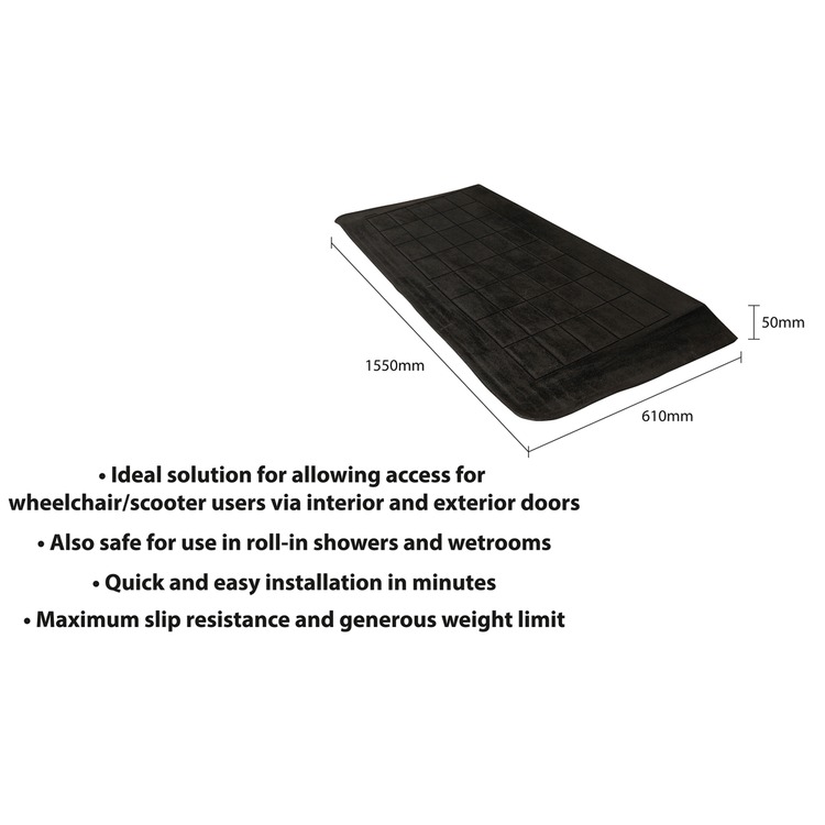 This H 50 x W 1550 x D 610 mm ramp is ideal for interior and exterior doors or thresholds, but is also safe for use in roll-in showers, wetrooms and any other application requiring vertical transition.