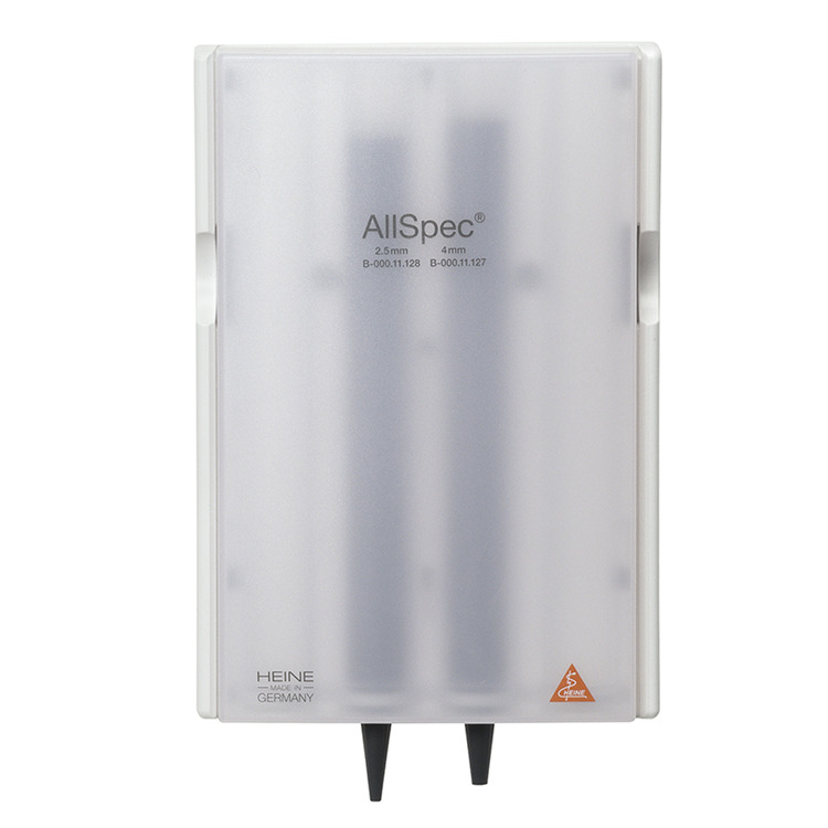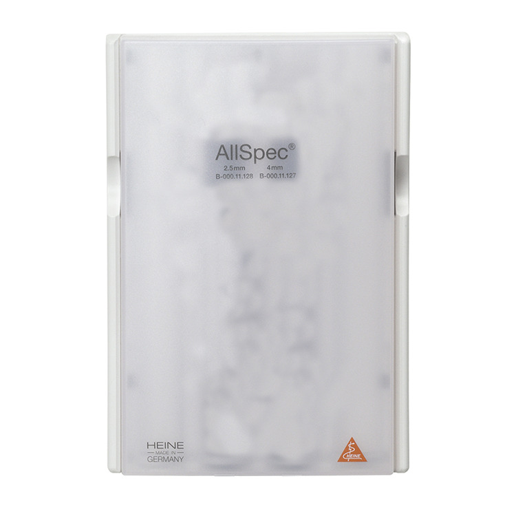 The Heine AllSpec Tip-dispenser holds 2 strips of 50 tips e.g.2.5mm (infant) & 4mm (adult)