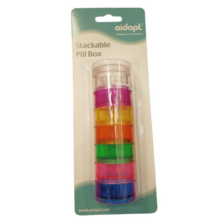 This ingenious stackable pill dispensing box has 7 coloured transparent compartments making it simple to check the tablets in each section. The bright, vibrant colours allow the visually impaired to easily differentiate between each level. Each large, round section screws easily into the base of the next to keep all your medication securely in one place.