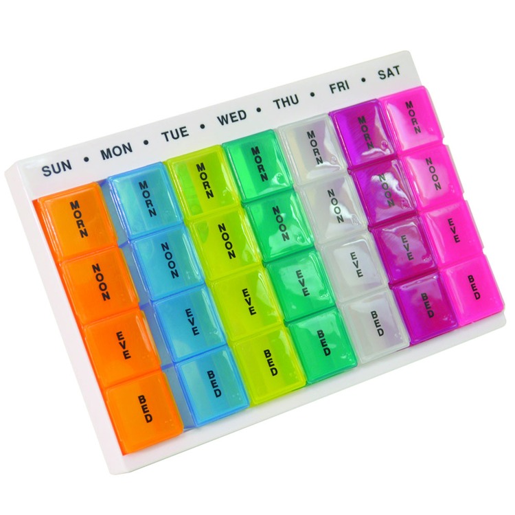 The Week Day Multi Pill Dispenser is ideal for people who take large numbers of tablets throughout the day at regular intervals. It has 4 compartments clearlymarked for each day at set times (Morning, Noon, Afternoon, Evening) in text and in braille. Each of the compartments can be removed and replaced as required, with simple flip top lids for easy access. The brightly coloured compartments make it easy for the visually impaired to differentiate between each day. It is ideal for everyday use at home or work and is also an ideal tablet dispenser for holidays.